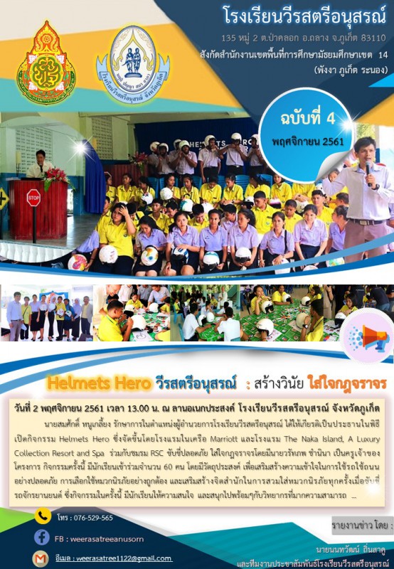 นายสมศ้กดิ์ หนูเกลี้ยง รักษาการในตำแหน่งผู้อำนวยการโรงเรียนวีรสตรีอนุสรณ์ ได้ให้เกียรติเป็นประธานในพิธีเปิดกิจกรรม Helmets Hero ซึ่งจัดขึ้นโดยโรงแรมในเครือ Marriott และโรงแรม The Naka Island, A Luxury Collection Resort and Spa ร่วมกับชมรม RSC ขับขี่ปลอดภัย ใส่ใจกฎจราจรโดยมีนายวรัทภพ ชำนินา เป็นครูเจ้าของโครงการ กิจกรรมครั้งนี้ มีนักเรียนเข้าร่วมจำนวน 60 คน โดยมีวัตถุประสงค์ เพื่อเสริมสร้างความเข้าใจในการใช้รถใช้ถนนอย่างปลอดภัย การเลือกใช้หมวกนิรภัยอย่างถูกต้อง และเสริมสร้างจิตสำนักในการสวมใส่หมวกนิรภัยทุกครั้งเมื่อขับขี่รถจักรยานยนต์ ซึ่งกิจกรรมในครั้งนี้ มีนักเรียนให้ความสนใจ และสนุกไปพร้อมๆกับวิทยากรที่มากความสามารถ