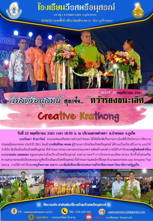 นายปัณยา สำเภารัตน์ นายกเทศมนตรีเทศบาลตำบลป่าคลอก ได้ให้เกียรติเป็นประธานในพิธีเปิดโครงการจัดงานประเพณีลอยกระทง ประจำปี 2561 โดยมี นายสิทธิโชค พรผล ผู้อำนวยการโรงเรียนวีรสตรีอนุสรณ์ ได้ร่วมเป็นเกียรติในงาน และให้กำลังใจ นักเรียนโรงเรียนวีรสตรีอนุสรณ์ ที่เข้าร่วมการประกวดกระทงประเภทความคิดสร้างสรรค์ ภายใต้กับกำกับของครูกิตติพงศ์ ศรีคง และนายแสน เมฆหมอก ครูและบุคลากรโรงเรียนวีรสตรีอนุสรณ์ จนสามารถคว้ารางวัลรองชนะเลิศมาครอง อีกทั้งยังส่งเสริมความสามารถของนักเรียนชมรมนาฏศิลป์โรงเรีนยนวีรสตรีอนุสรณ์ ที่เข้าร่วมการแสดงโชว์ชื่อชุด ตำนานลอยกระทง และ Amazing Thai Dance ภายใต้การกำกับของครูอัจฉราพร คงการ และทีมนักศึกษาฝึกประสบการณ์วิชาชีพจากมหาวิทยาลัยราชภัฏภูเก็ต ...