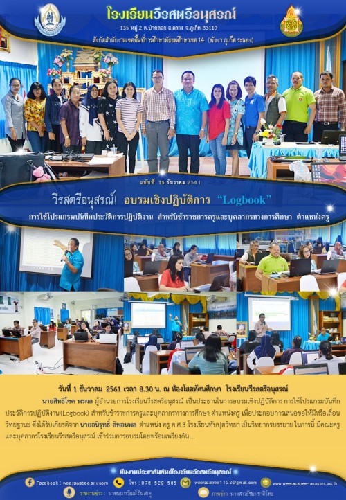 นายสิทธิโชค พรผล ผู้อำนวยการโรงเรียนวีรสตรีอนุสรณ์ เป็นประธานในการอบรมเชิงปฏิบัติการ การใช้โปรแกรมบันทึกประวัติการปฏิบัติงาน (Logbook) สำหรับข้าราชการครูและบุคลากรทางการศึกษา ตำแหน่งครู เพื่อประกอบการเสนอขอให้มีหรือเลื่อนวิทยฐานะ ซึ่งได้รับเกียรติจาก นายอนิรุทธิ์ ลิพอนพล ตำแหน่ง ครู ค.ศ.3 โรงเรียนทับปุดวิทยา เป็นวิทยากรบรรยาย ในการนี้ มีคณะครู และบุคลากรโรงเรียนวีรสตรีอนุสรณ์ เข้าร่วมการอบรมโดยพร้อมเพรียงกัน ...