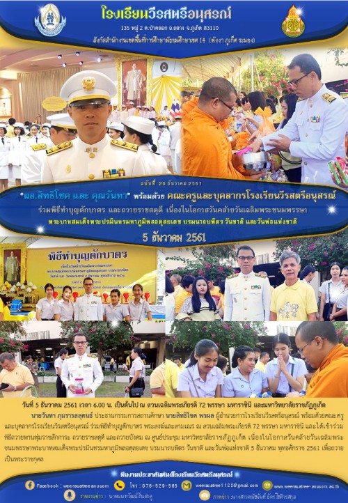 นายวันทา ภุมรารสสุคนธ์ ประธานกรรมการสถานศึกษา นายสิทธิโชค พรผล ผู้อำนวยการโรงเรียนวีรสตรีอนุสรณ์ พร้อมด้วยคณะครู และบุคลากรโรงเรียนวีรสตรีอนุสรณ์ ร่วมพิธีทำบุญตักบาตร พระสงฆ์และสามเณร ณ สวนเฉลิมพระเกียรติ 72 พรรษา มหาราชินี และได้เข้าร่วมพิธีถวายพานพุ่มราชสักการะ ถวายราชสดุดี และถวายบังคม ณ ศูนย์ประชุม มหาวิทยาลัยราชภัฏภูเก็ต เนื่องในโอกาสวันคล้ายวันเฉลิมพระชนมพรรษาพระบาทสมเด็จพระปรมินทรมหาภูมิพลอดุลยเดช บรมนาถบพิตร วันชาติ และวันพ่อแห่งชาติ 5 ธันวาคม พุทธศักราช 2561 เพื่อถวายเป็นพระราชกุศล