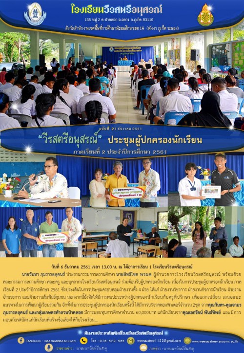 นายวันทา ภุมรารสสุคนธ์ ประธานกรรมการสถานศึกษา นายสิทธิโชค พรผล ผู้อำนวยการโรงเรียนวีรสตรีอนุสรณ์ พร้อมด้วยคณะกรรมการสถานศึกษา คณะครู และบุคลากรโรงเรียนวีรสตรีอนุสรณ์ ร่วมต้อนรับผู้ปกครองนักเรียน เนื่องในการประชุมผู้ปกครองนักเรียน ภาคเรียนที่ 2 ประจำปีการศึกษา 2561 ซึ่งประเด็นในการประชุมครอบคลุมฝ่ายงานทั้ง 4 ฝ่าย ได้แก่ ฝ่ายงานวิชาการ ฝ่ายงานกิจการนักเรียน ฝ่ายงานอำนวยการ และฝ่ายงานสัมพันธ์ชุมชน นอกจากนี้ยังจัดให้มีการพบปะระหว่างผู้ปกครองนักเรียนกับครูที่ปรึกษา เพื่อแลกเปลี่ยน เสนอแนะ แนวทางในการพัฒนาผู้เรียนร่วมกัน อีกทั้งในการประชุมผู้ปกครองนักเรียนครั้งนี้ ได้มีการบริจาคคอมพิวเตอร์จำนวน 2ชุด จากคุณวันทา-คุณจามร ภุมรารสสุคนธ์ และกลุ่มเกษตรทำสวนป่าคลอก มีการมอบทุนการศึกษาจำนวน 60,000บาท แก่นักเรียนจากคุณเอกรัตน์ พันธ์ทิพย์ และมีการมอบเกียรติบัตรแก่นักเรียนที่สร้างชื่อเสียงให้กับโรงเรียน...