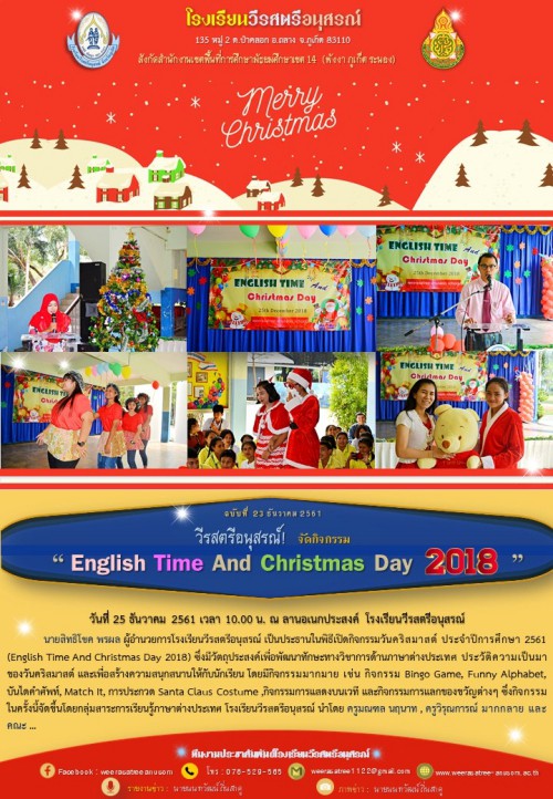 นายสิทธิโชค พรผล ผู้อำนวยการโรงเรียนวีรสตรีอนุสรณ์ เป็นประธานในพิธีเปิดกิจกรรมวันคริสมาสต์ ประจำปีการศึกษา 2561 (English Time And Christmas Day 2018) ซึ่งมีวัตถุประสงค์เพื่อพัฒนาทักษะทางวิชาการด้านภาษาต่างประเทศ ประวัติความเป็นมาของวันคริสมาสต์ และเพื่อสร้างความสนุกสนานให้กับนักเรียน โดยมีกิจกรรมมากมาย เช่น กิจกรรม Bingo Game, Funny Alphabet, บันไดคำศัพท์, Match It, การประกวด Santa Claus Costume ,กิจกรรมการแสดงบนเวที และกิจกรรมการแลกของขวัญต่างๆ ซึ่งกิจกรรมในครั้งนี้จัดขึ้นโดยกลุ่มสาระการเรียนรู้ภาษาต่างประเทศ โรงเรียนวีรสตรีอนุสรณ์ นำโดย ครูมณฑล นฤนาท , ครูวิรุณการณ์ มากกลาย และคณะ ...